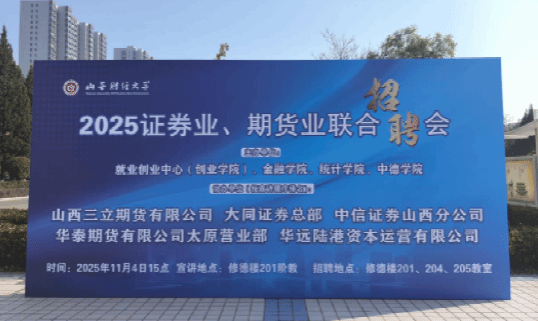 联合统计学院、中德学院共同举办了2025证券业、期货业联合招聘会。山西三立期货有限公司、大同证券总部、中信证券山西分公司、华泰期货有限公司太原营业部、华远陆港资本运营有限公司5家业内优质企业齐聚现场。山西财经大学就业创业中心主任,高潮